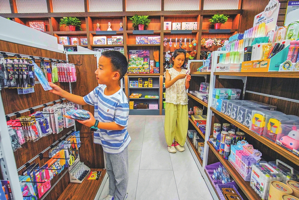 ⑤ 8月25日,河北省遵化市文化路街道的小朋友在文具商店选购学习用品。