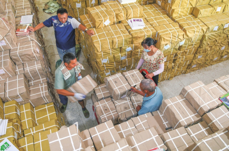 ② 8月25日,在湖南省永州市道县新华书店仓库,工作人员在搬运新学期教材。
