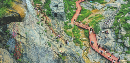 8月24日,许多游客来到夏县南大里乡果老神仙谷地质公园,探寻25亿年前火山喷发、地壳运动留下的“时光刻痕”,在怪石嶙峋、溪水潺潺、风光秀美的绿水青山间消夏纳凉,乐享闲暇美好时光。