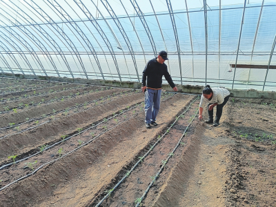 村党总支书记王志忠在农业产业园区温室了解西红柿种苗定植工作。