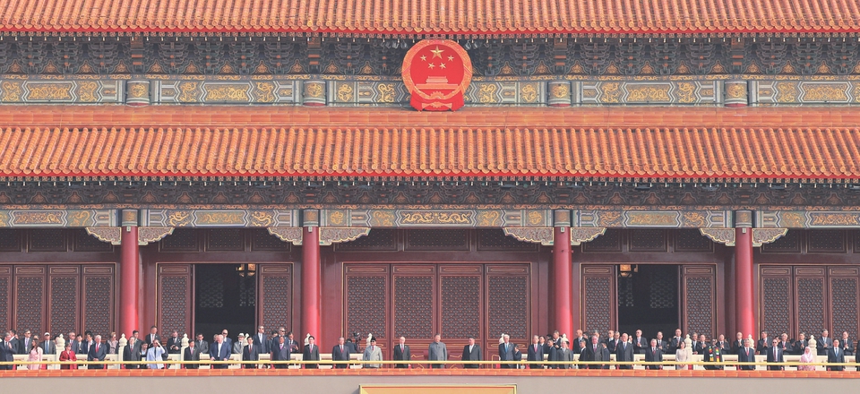 8时55分,习近平等中外领导人来到天安门城楼主席台,全场爆发出雷鸣般的掌声。