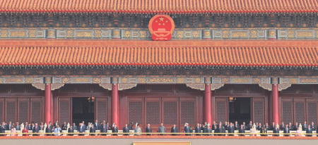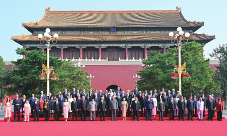大会开始前,习近平和夫人彭丽媛在端门外广场迎接出席大会的外方代表团团长及其配偶,并同他们合影留念。