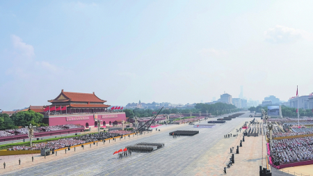 战旗猎猎,铁流滚滚。80面抗战英模部队荣誉旗帜组成的战旗方队,承载着历史荣光浩荡而来。这些英雄的旗帜、胜利的旗帜、不朽的旗帜,激励着人民军队勇往直前。装备方队编组陆上作战群、海上作战群、防空反导群、信息作战群、无人作战群、后装保障群、战略打击群隆隆驶来,接受检阅。新型坦克、无人智能、网电作战、高超声速、防空反导、战略导弹……从抗战时期土枪土炮到今天新型作战力量,国产现役主战装备和战略重器在天安门城楼前一一通过,展示坚决捍卫国家主权安全发展利益、坚定维护世界和平的钢铁意志和强大实力。