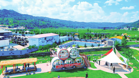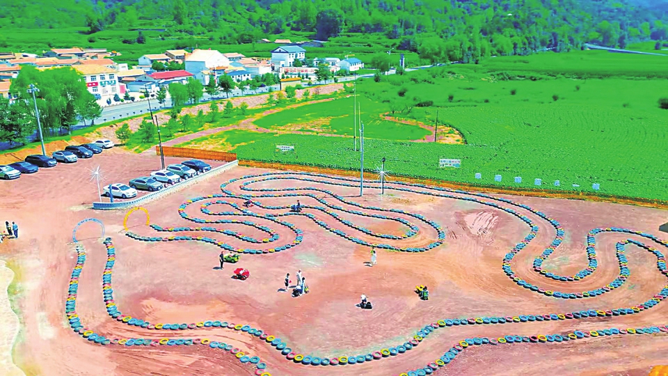 沿潇河源兴建的6000平方米主题文化公园尤为引人注目。在这里,自然造化与人文匠心完美交融,200株青松苍翠挺拔,9万株月季与各色草花编织成锦绣画卷,高大的水车悠悠转动,引得游人驻足沉醉。太阳能街灯如花朵般点缀其间,与露营区的袅袅炊烟、卡丁车场的跃动身影、向日葵田的金色波浪相映成趣,共同勾勒出一幅动静相宜的田园休闲图景。