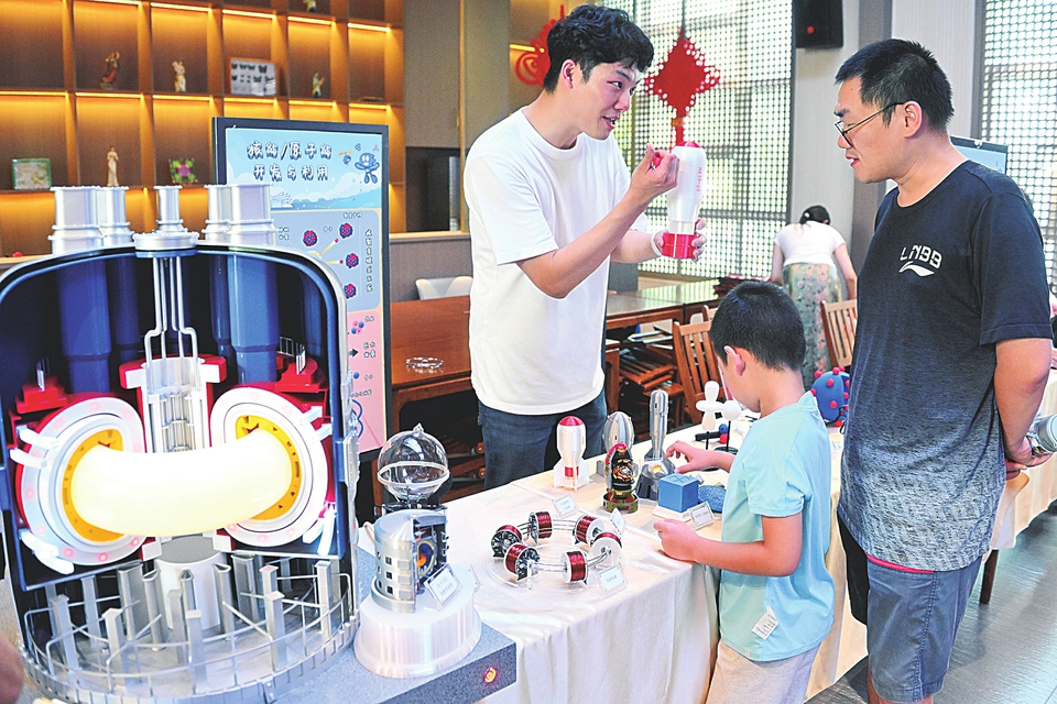 9月13日,科普志愿者为社区居民讲解。 9月13日,2025年上海市“全国科普月”活动在浦东新区周家渡街道举办科技创新成果展。活动聚焦“互动性、体验感、生活化”,邀请上海科技馆、上海中医药博物馆、上海集成电路科技馆、上海东方地质科普馆等多家科普基地共同参与,覆盖自然生态、智能科技、前沿制造、健康生活等多领域,吸引不同年龄层的社区居民参与体验互动。