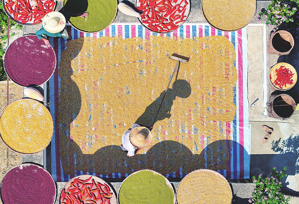 9月17日,安徽黄山歙县阳产村村民在土楼前晾晒农作物。 秋收时节,在安徽省黄山市歙县深渡镇阳产村,村民利用晴好天气,抓紧晾晒收获的辣椒、玉米、山核桃等农作物,描绘出一幅山村“晒秋”图。