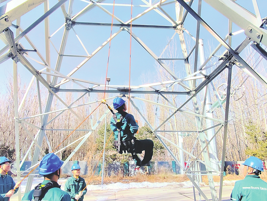 培训塔下,23名一线人员整齐列队。在党员骨干的带领下,全体参训人员迅速进入状态。“天气满足带电作业要求!”一声令下,几名老党员率先登塔示范。他们的任务是在500千伏2号培训塔上,带电更换右相复合绝缘子串。