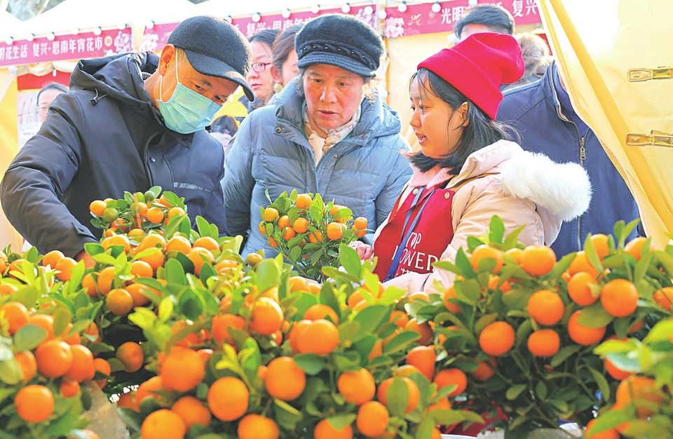 ①1月23日,市民游客在上海复兴公园年宵花市上选购小金橘。