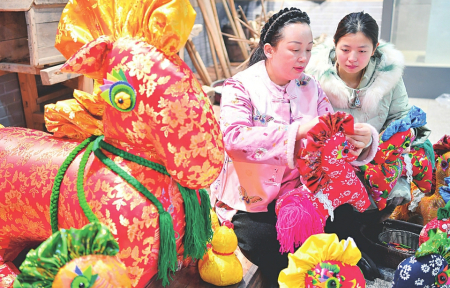 ② 1月22日,河南驻马店市非遗香包制作技艺传承人王彩红(左)赶制新春特色香包。