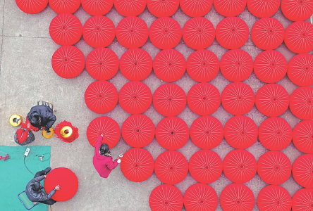 ③ 1月21日,在浙江省台州市仙居县横溪镇一家灯笼加工作坊,工人赶制大红灯笼。