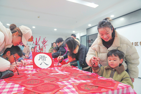 1月25日,在浙江省温州市鹿城区大南街道双莲桥社区,孩子与家长参加腊八节传统文化主题活动。新华社发(苏巧将摄)