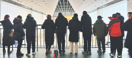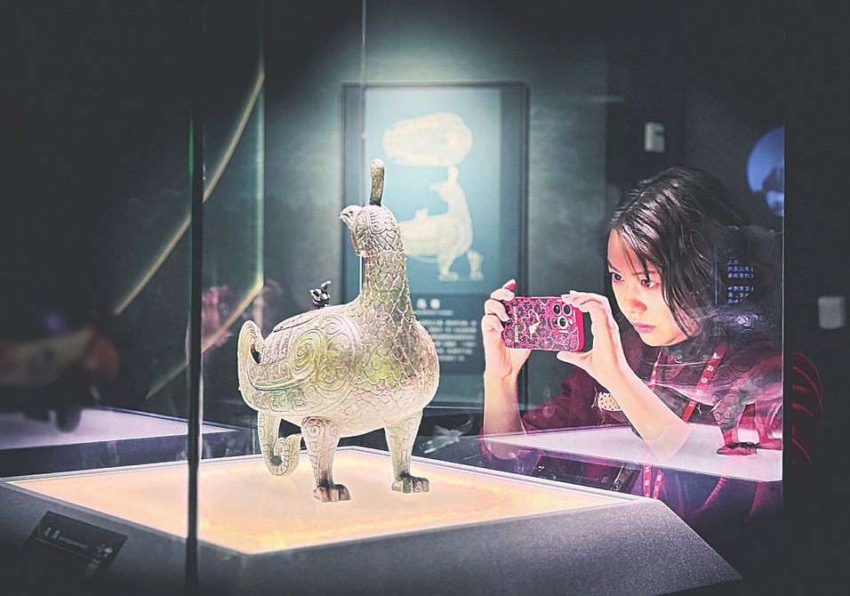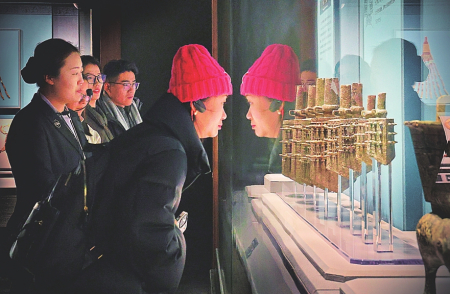游客在山西博物院欣赏馆藏青铜器。
