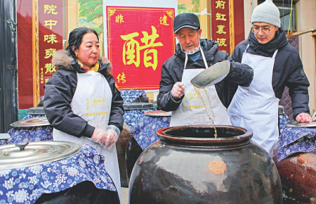 春节临近,食醋迎来产销旺季。位于襄汾县汾城镇北关村的永昌源醋业开发有限公司内,阵阵醇厚醋香扑鼻而来,呈现一派忙碌的生产景象。工人们正在采用古法酿造和现代工艺相结合的方式,加紧生产小米醋系列产品,全力保障春节市场供应。 图为永昌源醋业开发有限公司的工人们正在生产食用小米醋。