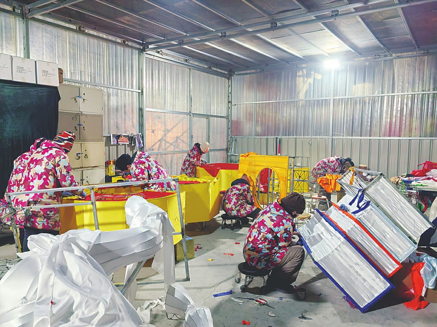 1月26日,记者在横渠村鸿鼎花灯厂看到,宽敞的车间内一派热火朝天。十几名工人各司其职,那些看似普通的金属丝,在他们满是老茧却异常灵巧的手中,通过精准的弯折,逐渐显露出“飞马”的轮廓。工人们将一个个部件仔细拼接、焊牢,为花灯构造出结实又精巧的骨架,再将LED灯带缠绕在花灯的骨架上。车间另一侧的裱糊室内,则是另一番细致景象:色彩艳丽的绸缎经过工人们精心裁剪,刷上特制胶,再平整地敷贴于灯架之上……