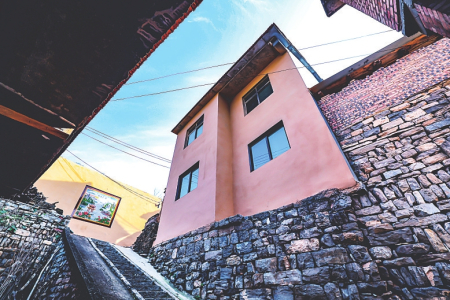 在这块崖上平台,400余户人家依山就势,次第而上。房屋层层叠叠,顺势退台,宛若“天阶石栈,似融入山体”。院落成组成带,如流云浮于山间。连接它们的道路,盘旋呈“之”字上行。每一处院落都仿佛自然生长,与背后的山脉、脚下的峡谷紧密相连——这既是先民融入自然的生态智慧,也是历史流变下对土地的深沉敬畏。