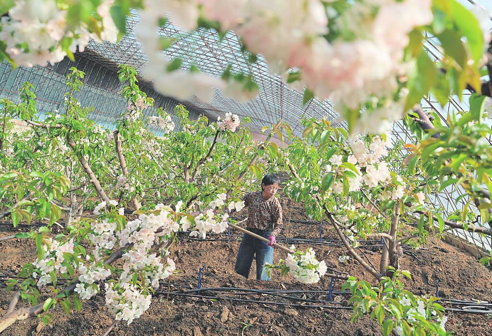 1月31日,河北省秦皇岛市海港区鑫兴家庭农场的雇工在樱桃大棚内除草。 冬日里,河北省秦皇岛市海港区的大棚樱桃树相继开花、结果,果农们忙着管护,呈现出一派繁忙的景象。近年来,秦皇岛市根据当地气候和土壤特点,引导农民在丘陵和浅山区因地制宜种植樱桃树,促进山坡增绿、农民增收,助力乡村振兴。