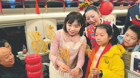 8时30分,记者登上G380次列车,这是从太原直达北京西站的标杆列车。上午9时,一场精彩的文艺演出在车厢里上演:悠扬的小提琴声拂去旅客旅途的疲惫;活力满满的歌舞表演,让团圆的喜悦在车厢里传递;沙画表演者指尖轻轻流转,勾勒出一幅幅归途与家园的画面,将温暖与期盼藏进细腻的沙影中……