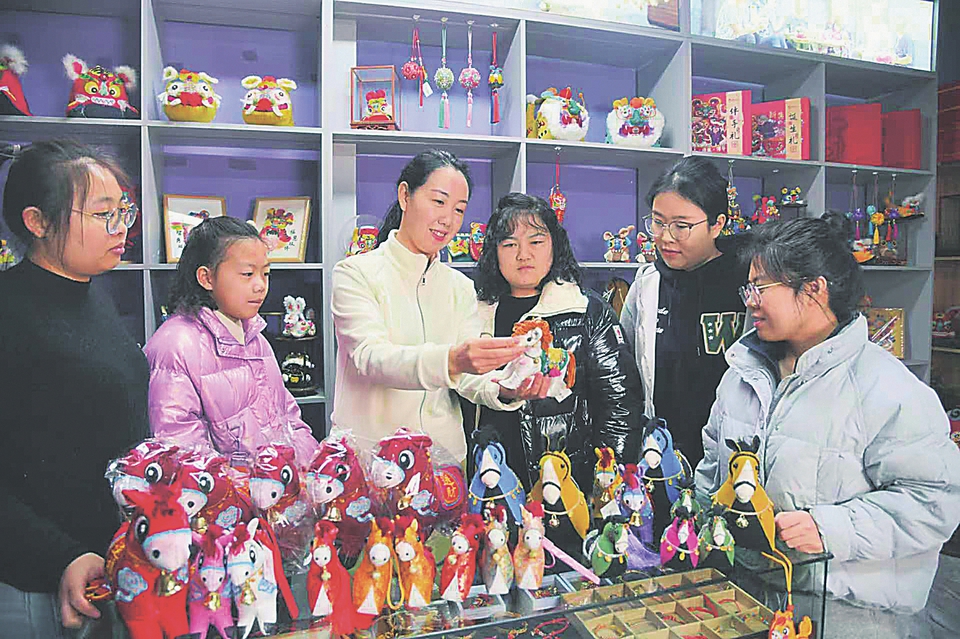2月5日,在闻喜县非遗布艺传承人张静的工作室内,琳琅满目的布艺文创产品整齐陈列,让人目不暇接。摆放在柜台上的布艺小马造型多样,或昂首扬蹄,或呆萌灵动,身上绣有“马到成功”“龙马精神”等吉祥字样,并搭配牡丹、祥云等传统经典纹样,将非遗文化与节日气氛完美融合。 图为闻喜县非遗布艺传承人张静(左三)正在向消费者介绍如何选购布艺小马。