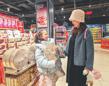 此外,作为年货采购“主战场”的超市也充满创意,亿家亲购物广场、永辉超市、盒马鲜生等大型商超的“年货大街”早已热闹非凡。“永辉超市与森宝联名推出的‘骏马献瑞’坚果礼盒很好看,外包装的奔马图案融入传统剪纸工艺,拿着送朋友特别有面子。”正在永辉超市(中正天街店)选购年货的市民管亚茹向记者介绍道。