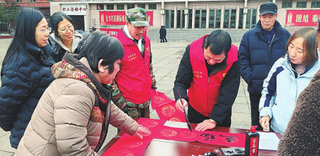 春节将至,年味渐浓。2月4日,山西焦煤汾西矿业水峪煤业党团志愿者在悦民广场暖心开展便民服务活动。活动现场,书法爱好者挥毫泼墨写春联,将新春的美好期盼凝于笔端;义诊区前,医务人员为群众测量血压,提供健康咨询与诊疗建议,受到群众点赞。图为书法爱好者现场书写春联。