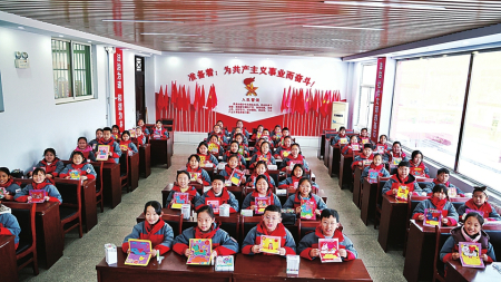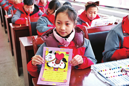 1月28日,一辆装载着特殊新春礼物的邦德物流货车从侯马市出发,驶向边海防一线。车内满载侯马药茶、运城锅巴、吕梁沙棘汁、闻喜煮饼等“山西味道”特色礼包以及该市小学生亲手绘制的贺卡,为戍边官兵送去新春祝福。图为小学生展示亲手绘制的贺卡。