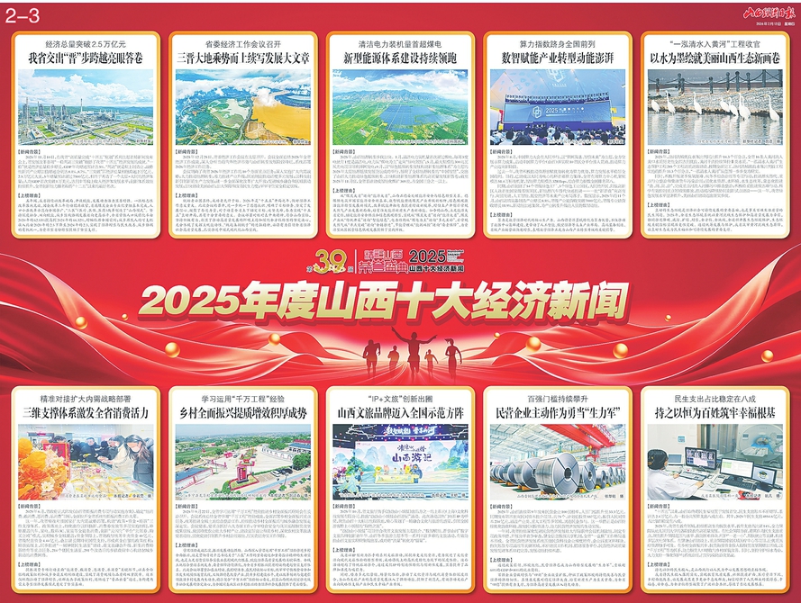 本报太原2月11日讯(记者李影)刚刚过去的2025年,是“十四五”规划冲刺收官、“十五五”规划谋篇布局之年,是山西坚定不移推动高质量发展、深化全方位转型的关键之年。这一年,三晋大地处处涌动着实干奋进的热潮。为此,山西经济日报今天发布2025年度山西十大经济新闻,全景式呈现我省年度经济发展脉络与亮点。