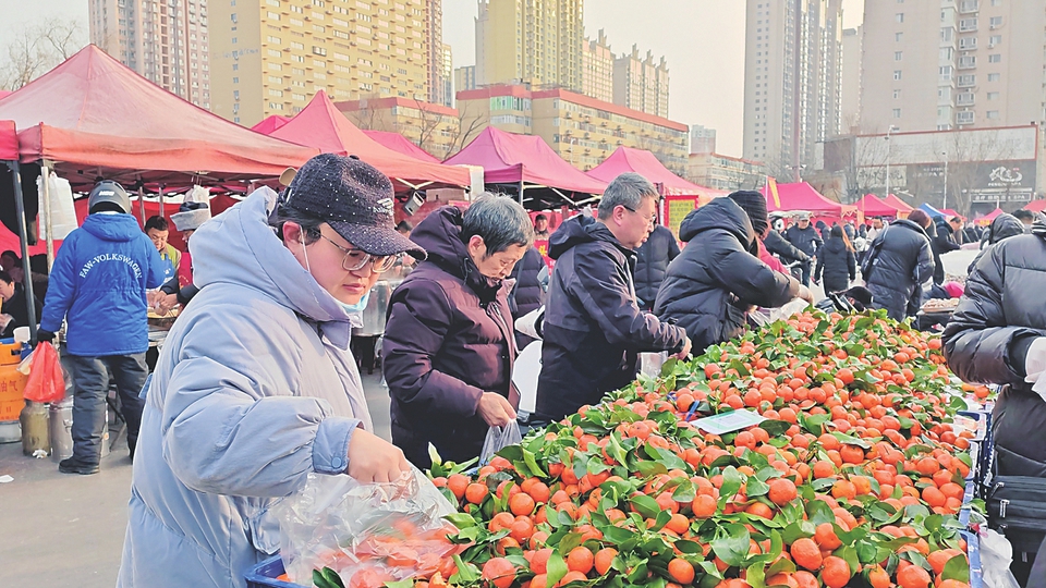 熙熙攘攘的人群里,老人们不慌不忙,对比着食材品质;年轻夫妇推着购物车,采买零食、果蔬与年饰;孩子们举着冰糖葫芦,在摊位间雀跃穿梭,眼睛里闪着快乐的光。每个人的袋子、小车都塞得满满当当——瓜果、干货、腊味、装饰……其中装的不仅是年货,更是对新春的期盼、对团聚的向往。寒风之中,一张张笑脸被灯笼映得通红,一声声问候透着暖意,将这座城市的烟火气与节庆氛围渲染得愈加浓郁绵长。