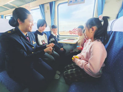林辉洁的“百宝箱”里装着各种小道具:拼图、涂鸦本、手指陀螺……遇到哭闹的孩子,她就变出小画本:“我们给小熊猫画个新家好不好?”若因旅途时间较长,孩子们开始焦躁,她便组织“车厢寻宝”游戏,把安全提示卡藏在座椅下,找到的孩子能兑换小玩具。一位年轻妈妈感慨:“本来担心孩子闹腾,没想到这趟旅程这么省心!”