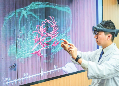 科研人员通过微米级脑机接口混合现实,精准呈现脑机接口与大鼠大脑主要血管和脑组织的空间位置关系。新华社记者肖艺九摄