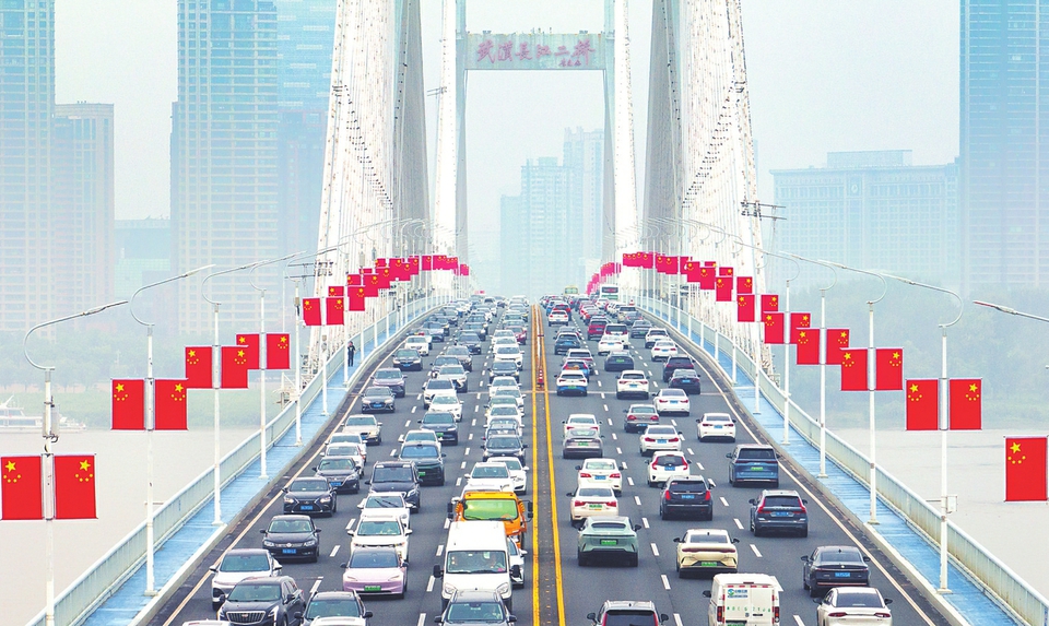 近年来,假日消费拉动作用增强,新的消费模式和业态层出不穷。图为2025年10月1日,国庆假期第一天,车辆行驶在湖北省武汉长江二桥上(无人机照片)。新华社记者肖艺九摄