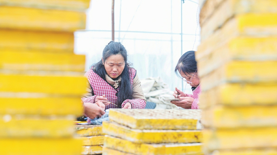 ④ 2月28日,在江苏省泗洪县孙园镇臧石村蔬菜育苗基地,菜农在大棚内种植催芽后的蔬菜种子。