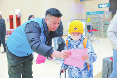 来自石家庄车辆段的志愿者张思豪发现一名坐轮椅的旅客后,主动上前询问:“您好,您是乘坐C800次列车吗?我推您进站吧。”他一路护送旅客至车厢座位,将轮椅折叠安放至行李架,并反复叮嘱注意事项,用贴心服务温暖旅客出行路。