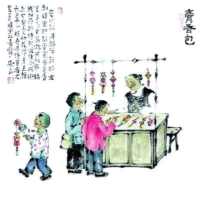 那年端午节,她在街巷里卖香包。那是个小孩子坐的小推车,上面被她梆了个十字架的木棍,横木上挂满了各种各样的香包。碰见我们,她便大声嚷嚷道:“总算等着你们啦,每天大眼瞪小眼,眼睛都盯的疼,满街人里面寻你们。我心里说你们都忙的不上街啦,还是有啥事了呢!”说着,笑吟吟地从一个包里掏出事先准备好的香包,并吩咐说:“这个绣有小兔子的是森娃的,这个绣了芙蓉花给我女女。另外这两个装了朱砂,辟邪的,是你们两个的。”她总把我家儿子叫“森娃”,姑娘叫“女女”,尤其喜欢我家丫头,一见女儿就满脸涌上了笑容,有好吃的就往她手里塞。那送给女儿香包上的芙蓉花,用黄灿灿的金丝线绣成,小巧玲珑,阳光下闪着亮亮的光。