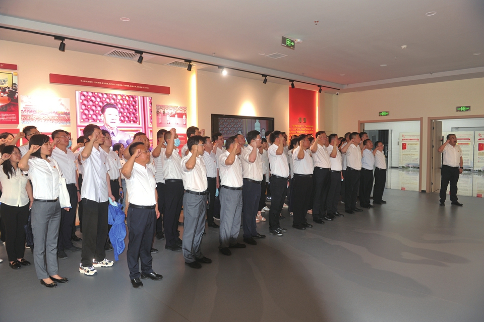活动中,党员干部们观看了彩色历史影像《开国大典》,参观了“百年恰是风华正茂”主题档案文献展。展览通过500余件珍贵档案文献、音像资料,以独特视角展示了中国共产党砥砺奋进的百年征程和伟大成就。大家跟随讲解员的介绍,认真学习了信仰的力量、理论的力量、组织的力量、人民的力量、斗争的力量、行动的力量、制度的力量及万山磅礴看主峰等展览的八个篇章内容。不同的篇章从多个角度全面展示了中国共产党波澜壮阔的百年奋斗历程和伟大成就,诠释了我们党不断取得胜利的成功密码和力量所在。大家从一张张泛黄卷边的纸张文稿、一组组照片及生动的有声影像中再次重温党带领全中国人民从艰难困苦走向幸福光辉,浴血奋战却永不言弃的真实写照。随后,全体党员干部面向党旗,庄严重温了入党誓词。