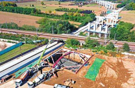 近日,由中交一公局第三工程有限公司承建的国道108线(襄汾-曲沃-侯马)过境改线工程(侯马段)虒祁侯阎铁路跨线桥转体主墩下承台顺利浇筑。该桥为项目全线重大节点控制性工程,一次性浇筑混凝土方量1261立方米,为后续上承台施工预埋转体转盘以及全桥主体施工奠定了坚实基础。