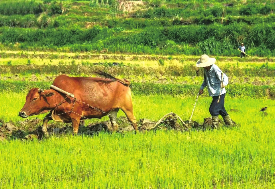 岁月更替,春暖花开,父亲又牵回一头牛,矮小短身,毛色通红,它没有角,头上只露出两个短短、圆圆的小桩桩,是一头母牛。父亲说这头牛年轻,可以生小牛犊儿。父亲把大白牛和小红牛合成了一驱,耕田的时候,两头牛齐肩并行,走的明显快了,老白牛再也不急喘了。这头小红牛虽然身材矮小,却肯出力气,总是一个劲地往前冲。相比之下,那头老白牛就有点偷奸耍滑的嫌疑,也因此挨了父亲不少鞭子。
