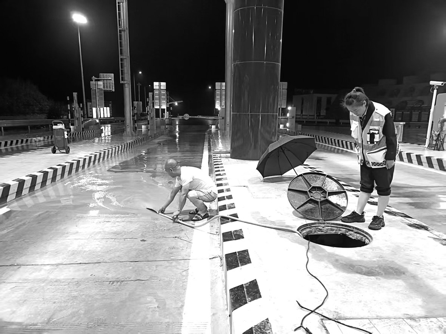 徒手清障保畅通,迎“汛”而上显担当。凌晨时分,暴雨突袭孝义西收费站,值班站长武维锋在巡查中发现入口排水沟因通讯管线缠绕杂草及施工垃圾导致排水受阻,雨水倒灌至收费机电检测井,随时可能引发系统短路。面对紧急情况,值班站长立即带领当班收费员展开清理工作,在铁锹无法剥离杂物的情况下,徒手清理垃圾,并启用污水泵抽排岗亭地沟积水。经过持续奋战至凌晨4点50分,积水隐患被彻底排除。
