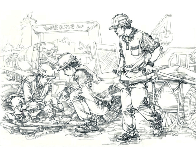 暮色渐浓,倦鸟归林,劳作了一天的人们也次第回家。一位扛着测量仪的老师傅步履蹒跚走向临时板房,头上累的大汗淋漓。一个大家喊“小王”的年轻技术员快步上前,接过老师傅扛着的测量仪。在接仪器的瞬间,老师傅惊呼:“小伙子,你手怎么这么烫?”小王笑着说:“天天泡在工地,顶着毒花花的日头,接触的都是发烫的东西,手也变成‘电烙铁’了,能不烫吗?”“那快叫你对象来给你降降温吧!”老师傅戏谑道。“您就别埋汰我了,对象都要泡汤了。”说这话时小王带着一丝别人不易觉察的酸楚。