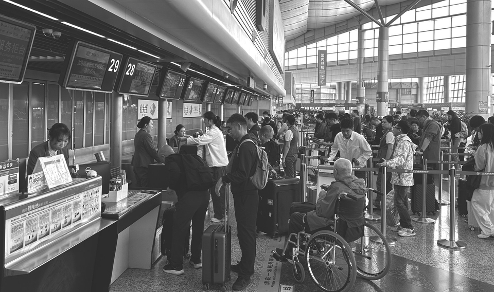 图2:为高效应对客流高峰,太原武宿国际机场增派工作人员现场引导,加密“急客”广播频次,方便旅客快速办理登机手续。仙博 摄