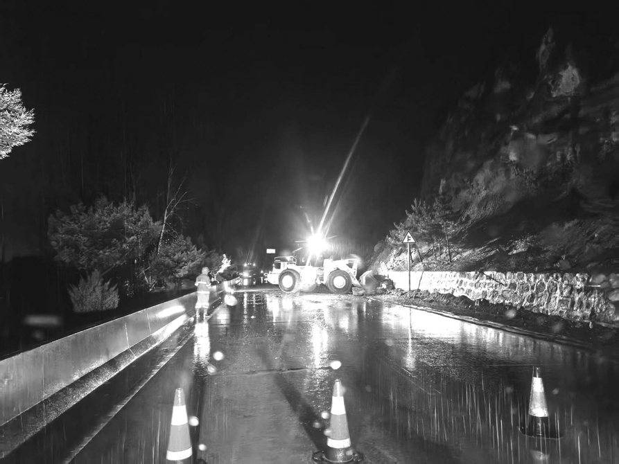 10月10日凌晨,省道南沁线K53+674处突发山体崩塌,塌方体占据半幅路面,影响车辆正常通行。接到险情报告后,长治公路分局武乡段迅速启动应急预案,组织机械设备和养护人员赶赴现场,投入抢险作业。经连夜冒雨抢修,至凌晨4时许,路面塌方体全部清理完毕,道路恢复通行,有效保障了干线公路的安全畅通。