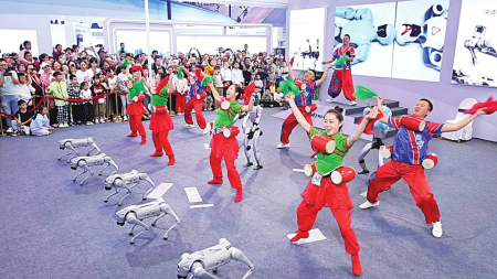 •   8月24日,第七届山西文化产业博览交易会现场,一曲跨越千年的“古今和鸣”正在上演——国家级非物质文化遗产翼城花鼓的铿锵鼓点,与宇树科技机器人、机器狗的机械韵律碰撞交织,为观众带来一场打破时空边界的文化盛宴。