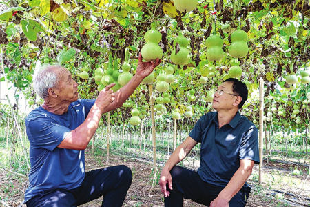 8月27日,万荣葫芦烙画市级代表性传承人吴从礼(左)与皇甫乡葫芦种植基地的技术人员一道观看长势喜人的大葫芦。今年,皇甫乡葫芦生产基地种植了莲花葫芦、酒葫芦等特种形状的品种,除满足运城市非遗项目万荣葫芦烙画皇甫村工作室的加工需求外,还供应全国各地用户,预估亩产可收入万元以上。