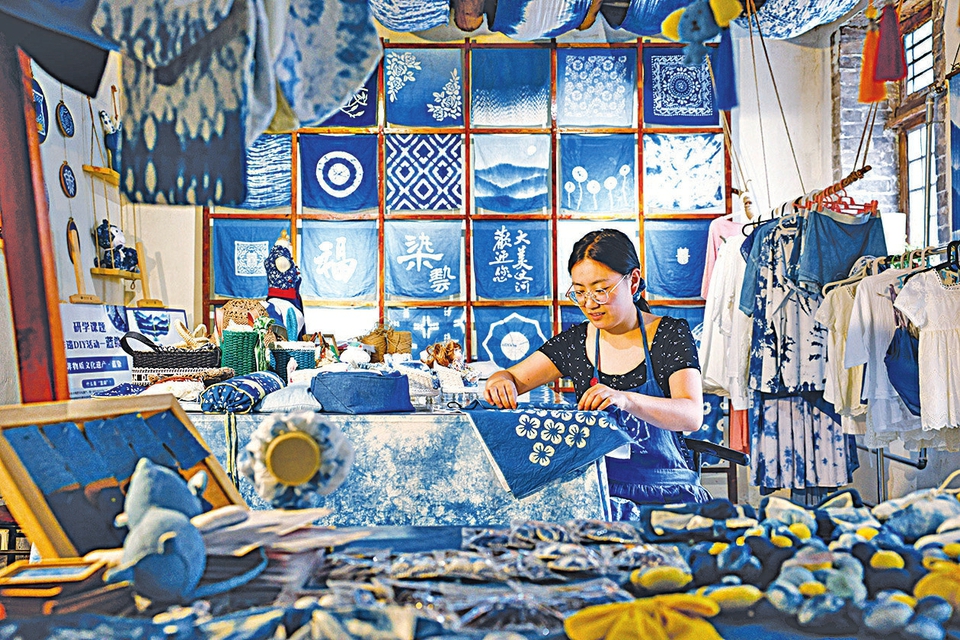 近日,晋城市陵川县丈河村26岁的返乡青年秦珂正在整理纯天然植物蓝染产品。近年来,河南、河北、山东、北京等地的游客猛增,秦珂开办的非遗蓝染产品走俏,供不应求,月纯收入7万多元,成为村里返乡创业致富带头人。