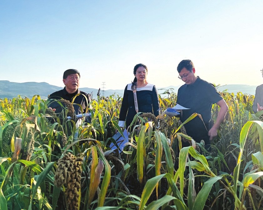 10月13日,在阳城县芹池镇油坊头村优质红苗谷种植基地,清华大学科研人员陈林(右)、陈灏(中)深入田间地头,实地查看谷子生长态势,针对“双抢一保”(抢收抢种保丰收)工作为农户开展专项技术指导,详细解答农户种植过程中的技术难题,以专业力量为丰收保驾护航。