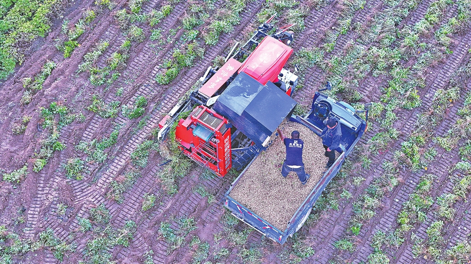 10月13日,万荣县裴庄乡黄河滩花生地里,村民们抓住天气晴好的有利时机,抢收、装车、转运,田间地头到处一派忙碌的丰收景象。全程实现机械化作业,大幅节省人力投入,显著降低了种植成本。