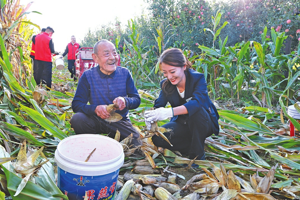 雨过天晴的田间还弥漫着雨水的湿气,泥土粘连难行,队员们却二话不说挽起裤腿、戴上手套,迅速分工投入战斗。有的弯腰掰玉米,有的负责转运,有的就地剥去湿腐的外皮,大家踩着泥泞来回穿梭,额头上很快渗出细密的汗珠,潮气与汗水在脸上交织,却没人停下手中的活计。“翟大爷,您别着急,我们今天一定帮您把玉米全收完!”志愿者一边麻利地掰着玉米,一边高声安抚着一旁忙碌的翟大爷。
