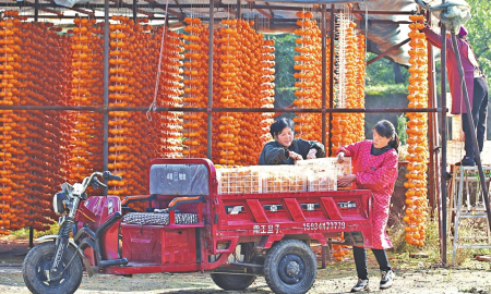 10月28日,运城市新绛县柿子喜获丰收。在阳王镇禅曲村许永安家中的“家庭微农场”和“家庭微工厂”里,众多柿农在进行转运、加工、削皮与上架晾晒,一派繁忙有序的丰收景象。