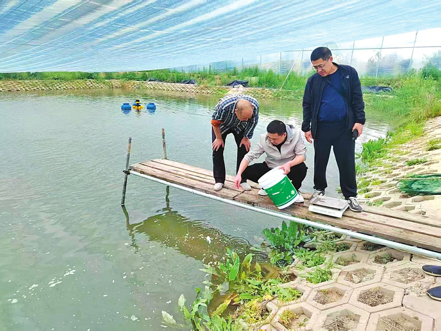 专家在永济良种站进行加州鲈池塘生态养殖生长监测。