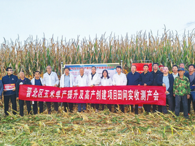 由山西农业大学(山西省农业科学院)生态农牧研究所承担的单产提升项目——晋北区玉米单产提升及高产创建项目,在应县建立了500亩核心示范基地,示范基地在“四良”融合的基础上,建立“高校+政府+企业+农户”的推广模式,主推瑞普9013优质品种,采用膜侧播种滴灌水肥精量绿色高产栽培技术,辐射晋北万亩玉米生产。经实收测产,亩产达到1275.7公斤。该项目为晋北玉米主产区提供了可复制可推广的高效“吨粮田”建设方案。