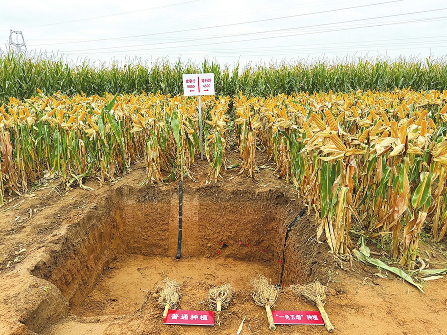 “一免”即播前免整地,隔年深松翻,蓄水保墒节能;“五增”即“增墒”,沟播探墒,垄沟集雨,抗旱保苗;“增养”,秸秆归垄腐熟,菌肥同播,培肥地力;“增密”,增株抗倒耐密,增加亩穗数;“增绿”,测土分次施肥,增加穗粒数,机械除草节肥药;“增重”,一喷多促,延迟收获增粒重。